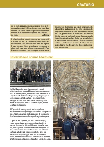 15ORATORIODall%u2019 1 al 5 gennaio, come di consueto, si %u00e8 svolto il pellegrinaggio del gruppo Adolescenti composto da ragazzi dalla 1%u00aa alla 5%u00aa superiore, don ed educatori, per un totale di 57 partecipanti che hanno intrapreso un pellegrinaggio in Campania unendo fede, cultura e crescita spirituale. Il viaggio ha avuto come meta diversi luoghi di grande importanza religiosa, storica e culturale: Napoli, Pompei, Caserta e Montecassino. Il 1%u00b0 gennaio, il nostro gruppo %u00e8 partito in pullman, intraprendendo un lungo viaggio notturno che ci ha portato fino a Napoli, con un po%u2019 di ritardo causato da un incidente e da un%u2019anomala nebbia che ha colpito la regione Campania.La giornata del 2 gennaio, una volta arrivati a Napoli, %u00e8 stata caratterizzata da due momenti significativi. Al mattino, il gruppo ha visitato il Museo di Jago e la chiesa blu, dove ha potuto ammirare le straordinarie opere d%u2019arte del giovane scultore. La visita ha suscitato una riflessione profonda sulla bellezza e sul significato che l%u2019arte pu%u00f2 trasmettere. Nel pomeriggio, dopo una pizza davvero buona, abbiamo avuto la fortuna di incontrare ed ascoltare la testimonianza del parroco del quartiere Sanit%u00e0, don Luigi, Pellegrinaggio Gruppo Adolescenti ma in modo graduale ci siamo avvicinati al cuore di Roma, raggiungendolo l%u2019ultimo giorno a pochi metri dalla tomba di San Pietro. Sono stati giorni in cui le emozioni non sono mancate e che terr%u00f2 preziose nella mente e%u2026 nel cuore.AntonellaIl pellegrinaggio a Roma %u00e8 stato una vera opportunit%u00e0 d%u2019incontro con Dio e di cammino insieme ai nostri cresimandi che si sono dimostrati veri fedeli del Signore.%u00c9 stato toccante il loro raccoglimento percorrendo in ginocchio la scala santa, ed emozionante quando il Papa ha riservato un saluto speciale proprio ai cresimandi di Almenno San Bartolomeo. Un grande ringraziamento a don Andrea, guida preziosa, che ci ha accompagnato lungo il nostro cammino di fede, avvicinandoci sempre pi%u00f9 a Dio, permettendoci di riconoscerLo e dandoci le chiavi di lettura di molte delle storie che riguardano la citt%u00e0 di Roma. Grazie anche a Marina, per la sua dedizione premurosa verso i nostri ragazzi. Presenza amorevole e fidata. %u00c9 stato un vero cammino di riflessione, e di gioia nell%u2019aprire il nostro cuore allo stupore e alla meraviglia di conoscerLo. Lisa