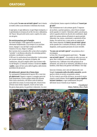 12ORATORIOLa frase guida %u201cIo sono con voi tutti i giorni%u201d non %u00e8 rimasta un motto scritto su uno striscione: %u00e8 diventata vita vissuta.In ogni gioco, in ogni abbraccio, in ogni litigio ricomposto, si %u00e8 sperimentata la vicinanza di un Dio che non ci abbandona, che %u201cbussa%u201d alla porta del nostro cuore e aspetta che siamo noi ad aprire. Un servizio prezioso per le famigliePer molte famiglie, il CRE rappresenta un punto di riferimento fondamentale. In un tempo in cui conciliare lavoro, impegni e cura dei figli %u00e8 sempre pi%u00f9 difficile, l%u2019oratorio si fa casa, rifugio e sostegno. Ma il servizio che la comunit%u00e0 offre va ben oltre la semplice %u201ccustodia%u201d: %u00e8 un%u2019alleanza educativa che coinvolge genitori, animatori, coordinatori e sacerdoti.Il CRE non %u00e8 la sostituzione di una babysitter: %u00e8 un%u2019occasione per crescere insieme, per educare al rispetto, alla condivisione, alla gioia semplice dello stare insieme nella via del Vangelo. La comunit%u00e0 cristiana si fa davvero madree padre, capace di farsi carico delle fragilit%u00e0 e delle fatiche quotidiane dei pi%u00f9 piccoli.Gli adolescenti: giovani che si fanno donoTra i protagonisti fondamentali di questo CRE ci sono loro: gli adolescenti. Ragazzi e ragazze, la maggior parte dei quali frequentano il nostro gruppo adolescenti durante tutto l%u2019anno catechistico, che hanno scelto di dedicare parte della loro estate al servizio degli altri. Alcuni di loro all%u2019inizio erano timidi, impauriti, incerti sul loro ruolo. Ma giorno dopo giorno, tra gavettoni e laboratori, tra corse e chiacchierate, hanno scoperto la bellezza di %u201cesserci per gli altri%u201d.Fare l%u2019animatore non %u00e8 solo animare giochi. %u00c8 imparare ad ascoltare, a portare pazienza, a dare il buon esempio anche quando si %u00e8 stanchi. %u00c8 diventare adulti a piccoli passi, sotto lo sguardo attento ma discreto dei coordinatori, degli adulti che ruotano attorno all%u2019oratorio in questo periodo (laboratori, bar, mensa, camminate) e soprattutto di Don Andrea. Per molti di loro, %u00e8 stato anche un cammino di fede: hanno imparato che Ges%u00f9 %u00e8 con noi tutti i giornianche quando non ci sentiamo all%u2019altezza, anche quando sbagliamo, anche quando pensiamo di essere invisibili.%u201cIo sono con voi tutti i giorni%u201d: una promessa che ci accompagnaLa frase che ci ha accompagnato quest%u2019anno %u2013 %u201cIo sono con voi tutti i giorni%u201d %u2013 ha assunto un volto, una voce, un gesto. Non %u00e8 rimasta un versetto astratto, ma %u00e8 diventata esperienza viva. L%u2019abbiamo vista nella pazienza di un animatore, nel sorriso di un volontario, nell%u2019abbraccio di un bambino, nella fiducia dei genitori nell%u2019affidarci i loro figli.Ges%u00f9 non %u00e8 lontano, non %u00e8 solo nel tabernacolo o nei Vangeli: %u00e8 presente nella vita della comunit%u00e0, quando questa si mette al servizio con gratuit%u00e0 e amore. Toc Toc %u00e8 stata la voce di Dio che bussa, ma anche la nostra risposta a quel richiamo. Perch%u00e9 aprire la porta significa lasciarsi cambiare, e ogni cambiamento che parte dall%u2019amore lascia il mondo un po%u2019 migliore.I CoordinatoriChiara, Federica, Alice e Paola