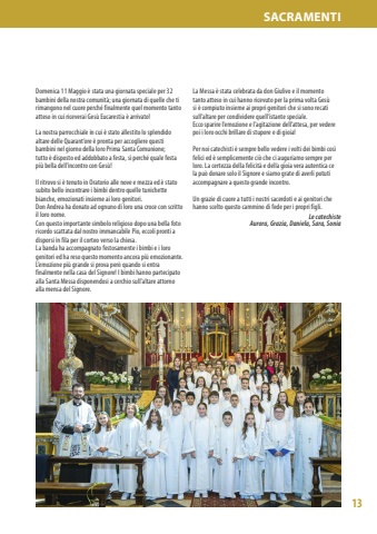 13SACRAMENTI Domenica 11 Maggio %u00e8 stata una giornata speciale per 32 bambini della nostra comunit%u00e0; una giornata di quelle che ti rimangono nel cuore perch%u00e9 finalmente quel momento tanto atteso in cui riceverai Ges%u00f9 Eucarestia %u00e8 arrivato!La nostra parrocchiale in cui %u00e8 stato allestito lo splendido altare delle Quarant%u2019ore %u00e8 pronta per accogliere questi bambini nel giorno della loro Prima Santa Comunione; tutto %u00e8 disposto ed addobbato a festa, s%u00ec perch%u00e9 quale festa pi%u00f9 bella dell%u2019incontro con Ges%u00f9!Il ritrovo si %u00e8 tenuto in Oratorio alle nove e mezza ed %u00e8 stato subito bello incontrare i bimbi dentro quelle tunichette bianche, emozionati insieme ai loro genitori. Don Andrea ha donato ad ognuno di loro una croce con scritto il loro nome. Con questo importante simbolo religioso dopo una bella foto ricordo scattata dal nostro immancabile Pio, eccoli pronti a disporsi in fila per il corteo verso la chiesa. La banda ha accompagnato festosamente i bimbi e i loro genitori ed ha reso questo momento ancora pi%u00f9 emozionante.L%u2019emozione pi%u00f9 grande si prova per%u00f2 quando si entra finalmente nella casa del Signore! I bimbi hanno partecipato alla Santa Messa disponendosi a cerchio sull%u2019altare attorno alla mensa del Signore. La Messa %u00e8 stata celebrata da don Giulivo e il momento tanto atteso in cui hanno ricevuto per la prima volta Ges%u00f9 si %u00e8 compiuto insieme ai propri genitori che si sono recati sull%u2019altare per condividere quell%u2019istante speciale. Ecco sparire l%u2019emozione e l%u2019agitazione dell%u2019attesa, per vedere poi i loro occhi brillare di stupore e di gioia!Per noi catechisti %u00e8 sempre bello vedere i volti dei bimbi cos%u00ec felici ed %u00e8 semplicemente ci%u00f2 che ci auguriamo sempre per loro. La certezza della felicit%u00e0 e della gioia vera autentica ce la pu%u00f2 donare solo il Signore e siamo grate di averli potuti accompagnare a questo grande incontro.Un grazie di cuore a tutti i nostri sacerdoti e ai genitori che hanno scelto questo cammino di fede per i propri figli. Le catechiste Aurora, Grazia, Daniela, Sara, Sonia