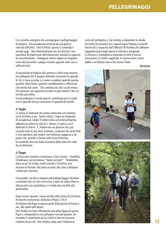 15PELLEGRINAGGIEcco un%u2019altra categoria che accompagna il pellegrinaggio: la lentezza. Che paradosso! Lentezza da una parte e velocit%u00e0 dall%u2019altra. Fare in fretta: questo ci comanda il mondo oggi. Non dimentichiamo che la velocit%u00e0 %u00e8 una macchina di dispersione dell%u2019attenzione, annulla la capacit%u00e0 di concentrazione. L%u2019indugiare invece regala un singolare senso del presente e adagia il nostro sguardo sulle cose e sulle persone.Assaporando la bellezza del cammino e dello stare insieme, noi pellegrini del 2 giugno, abbiamo incrociato lo sguardo di chi ci stava accanto e ci siamo scambiati qualche parola, qualche chiacchiera, qualche considerazione e riflessione che veniva dal cuore. %u201cChi cammina da solo va pi%u00f9 veloce, chi cammina con qualcuno accanto va pi%u00f9 lontano%u201d dice un vecchio proverbio.Essere pellegrini %u00e8 anche questo: camminare per le strade con lo sguardo alto per incontrare lo sguardo dei fratelli.2a TappaLa chiesa di Ambivere che prima vedevamo cos%u00ec lontana, era l%u00ec di fronte a noi. Siamo entrati. Dopo un momento di accoglienza e dopo il timbro sulla carta del pellegrino, abbiamo ascoltato la vita di S. Zenone, il santo a cui %u00e8 dedicata la chiesa. S. Zenone era un giovane che, pur essendo nato in una terra straniera, sostenuto da tanta fede e viva speranza, ag%u00ec sempre con luminosa saggezza a tal punto che, quando si ferm%u00f2 nella terra di Verona,fu nominato Vescovo dalla comunit%u00e0 della citt%u00e0 che salv%u00f2 da un%u2019alluvione.3a TappaLa fatica del cammino cominciava a farsi sentire. I bambini chiedevano con insistenza: %u201cSiamo arrivati?%u201d. Finalmente, dopo un po%u2019 di strada, siamo arrivati a Cerchiera, una frazione di Pontida. Nel prato accanto alla chiesa abbiamo sostato per il pranzo.Essenzialit%u00e0: un%u2019altra categoria del pellegrinaggio. Rendere essenziale solo ci%u00f2 che serve aiuta a dare un valore diverso alle piccole cose quotidiane e ci rende pi%u00f9 sensibili alla gratitudine.Dopo esserci riposati, siamo entrati nella chiesa di Cerchiera; di recente costruzione, dedicata al Papa S. Pio X. Un dipinto del Papa occupava parte della parete di fronte a noi, alle spalle dell%u2019altare. Don Andrea ha fatto riferimento alla bella figura di questo Papa e, rivolgendosi a noi pellegrini non pi%u00f9 giovani, ha ricordato il catechismo da lui scritto e che noi avevamo studiato da piccoli. Don Andrea, dopo aver timbrato la carta del pellegrino; ci ha invitato a riprendere la strada. Un tratto di cammino tra i vigneti sopra Pontida e ai bordi dei boschi ci separava dall%u2019 Abbazia di Pontida che abbiamo raggiunto passo dopo passo in silenzio e pregando. In silenzio e in preghiera, elevando al cielo le nostre invocazioni, le nostre suppliche, le nostre ansie i nostri dubbi e un%u2019infinita lode a Dio nostro Padre. Nicoletta