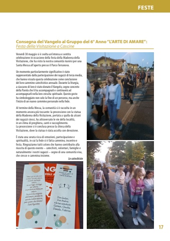 17FESTEConsegna del Vangelo al Gruppo del 6%u00b0 Anno %u201cL%u2019ARTE DI AMARE%u201d: Festa della Visitazione a CascineVenerd%u00ec 30 maggio si %u00e8 svolta un%u2019intensa e sentita celebrazione in occasione della festa della Madonna della Visitazione, che ha visto la nostra comunit%u00e0 riunirsi per una Santa Messa all%u2019aperto presso il Parco Terranova.Un momento particolarmente significativo %u00e8 stato rappresentato dalla partecipazione dei ragazzi di terza media, che hanno vissuto questa celebrazione come conclusione del loro cammino catechistico annuale. Durante la liturgia, a ciascuno di loro %u00e8 stato donato il Vangelo, segno concreto della Parola che li ha accompagnati e continuer%u00e0 ad accompagnarli nella loro crescita spirituale. Questo gesto ha simboleggiato non solo la fine di un percorso, ma anche l%u2019inizio di un nuovo cammino personale nella fede.Al termine della Messa, la comunit%u00e0 si %u00e8 raccolta in un momento ancora pi%u00f9 toccante: la processione con la statua della Madonna della Visitazione, portata a spalla da alcuni dei ragazzi stessi, ha attraversato le vie della localit%u00e0, in un clima di preghiera, canti e raccoglimento.La processione si %u00e8 conclusa presso la chiesa della Visitazione, dove la statua %u00e8 stata accolta con devozione.%u00c8 stata una serata ricca di emozioni, partecipazione e spiritualit%u00e0, in cui la fede si %u00e8 fatta cammino, incontro e festa. Ringraziamo tutti coloro che hanno contribuito alla riuscita di questo evento %u2013 catechisti, volontari, famiglie e naturalmente i nostri ragazzi %u2013 segno di una comunit%u00e0 viva, che cresce e cammina insieme.Le catechiste