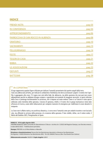 ANNO IV %u2013 N%u00b06 Luglio-Agosto 2025%u00abINSIEME Bollettino delle comunit%u00e0 di S.Bartolomeo e S.Rocco %u00bb iscritto al n. 5/2022 del Registro Stampa, con Decreto emesso in data 08/02/2022 %u2013 Pubblicazione periodica.Stampa: PRESSR3 snc di Rota Matteo e MarcelloDirezione e Amministrazione: Parrocchia San Bartolomeo Apostolo in Almenno San BartolomeoVia Vignola, 3 24030 Almenno San Bartolomeo (BG) - Tel. 035 640045 Parroco (Rev. Facchinetti Don Giulivo)Abbonamento annuale: 30,00 %u20ac %u2022Copia singola: 4,00 %u20acINDICEPRENDI NOTApag 03IN CONFIDENZApag 04APPROFONDIMENTOpag 06PARROCCHIA DI SAN ROCCO IN ALBENZApag 08ORATORIOpag 10SACRAMENTI pag 13PELLEGRINAGGIpag 14FESTEpag 17TESORI DI CASApag 21BIBBIApag 22LE ASSOCIAZIONIpag 23DEFUNTIpag 27BATTESIMIpag 28IN COPERTINAIl Logo rappresenta quattro figure stilizzate per indicare l%u2019umanit%u00e0 proveniente dai quattro angoli della terra. Sono una abbracciata all%u2019altra, per indicare la solidariet%u00e0 e fratellanza che deve accomunare i popoli. Si noter%u00e0 che l%u2019aprifila %u00e8 aggrappato alla croce. %u00c8 il segno non solo della fede che abbraccia, ma della speranza che non pu%u00f2 mai essere abbandonata perch%u00e9 ne abbiamo bisogno sempre e soprattutto nei momenti di maggiore necessit%u00e0. La parte inferiore della Croce si prolunga trasformandosi in un%u2019ancora, che si impone sul moto ondoso. Come si sa l%u2019ancora %u00e8 stata spesso utilizzata come metafora della speranza. L%u2019ancora di speranza, infatti, %u00e8 il nome che in gergo marinaresco viene dato all%u2019ancora di riserva, usata dalle imbarcazioni per compiere manovre di emergenza per stabilizzare la nave durante le tempeste. La Croce non %u00e8 affatto statica, ma anch%u2019essa dinamica, si curva verso l%u2019umanit%u00e0 come per andarle incontro e non lasciarla sola, ma offrendo la certezza della presenza e la sicurezza della speranza. %u00c8 ben visibile, infine, con il colore verde, il Motto del Giubileo 2025, Peregrinantes in Spem.