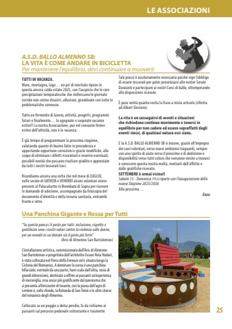 25LE ASSOCIAZIONITUTTI IN VACANZA.Mare, montagna, lago%u2026 un po%u2019 di meritato riposo in questa ancora calda estate 2025, con l%u2019auspicio che le rare precipitazioni temporalesche che rinfrescano le giornate torride non creino disastri, alluvioni, grandinate con tutte le problematiche connesse.Tutto un fermento di lavoro, attivit%u00e0, progetti, programmi futuri e finalmente%u2026 le agognate e sospirate vacanze estive!! La nostra Associazione, pur nel consueto fermo estivo dell%u2019attivit%u00e0, non %u00e8 in vacanza.%u00c8 gi%u00e0 tempo di programmare la prossima stagione, valutando quanto di buono fatto in precedenza e apportando opportune correzioni e giuste modifiche, allo scopo di eliminare i difetti riscontrati e inserire eventuali, possibili novit%u00e0 che possano risultare gradite e apprezzate da tutti i nostri tesserati/soci.Ricordiamo ancora una volta che nel mese di LUGLIO, nelle serate di GIOVED%u00cc e VENERD%u00cc alcuni volontari erano presenti al Palacalcetto in Brembate di Sopra per ricevere le domande di adesione, accompagnate da fotocopia del documento d%u2019identit%u00e0 e della tessera sanitaria, entrambi fronte e retro.%u201cSu questa panca c%u2019%u00e8 posto per tutti: inclusione, rispetto e gentilezza sono i nostri valori contro la violenza sulle donne, per un mondo in cui donare sia il gesto pi%u00f9 forte%u201d(Avis di Almenno San Bartolomeo)L%u2019installazione artistica, commissionata dall%u2019Avis di Almenno San Bartolomeo e progettata dall%u2019architetto Cesare Rota Nodari, %u00e8 stata collocata nel Parco della Fornace ed %u00e8 situata lungo la Ciclovia del Romanico. A dominare la scena %u00e8 una panchina bifacciale, normale da una parte, fuori scala dall%u2019altra, ossia di grandi dimensioni, destinata a offrire ai passanti un%u2019esperienza di meraviglia, resa ancor pi%u00f9 gratificante dal panorama che si presenta all%u2019orizzonte di levante, con la piana dell%u2019agro di Lemine e, sullo sfondo, la Rotonda di San Tom%u00e8 e le altre chiese del romanico degli Almenno. Collocata su un poggio a dolce pendio, fa da richiamo ai passanti sul percorso pedonale sottostante e trasmette Tale prassi %u00e8 assolutamente necessaria poich%u00e9 vige l%u2019obbligo di essere tesserati per poter presenziare alle nostre Serate Danzanti e partecipare ai nostri Corsi di ballo, ottemperando alle disposizioni ricevute.%u00c8 pura verit%u00e0 quanto recita la frase a inizio articolo (riferita ad Albert Einstein).La vita %u00e8 un susseguirsi di eventi e situazioni che richiedono continuo movimento e tenersi in equilibrio per non cadere ed essere sopraffatti dagli eventi stessi, di qualsiasi natura essi siano.E la A.S.D. BALLO ALMENNO SB si muove, grazie all%u2019impegno dei suoi volontari, verso nuovi ambiziosi traguardi, sempre con uno spirito di aiuto verso il prossimo e di dedizione e disponibilit%u00e0 verso tutti coloro che vorranno venire a trovarci e conoscere questa nostra realt%u00e0, motivati dall%u2019affetto e dalle gratifiche ricevute.SETTEMBRE %u00e8 ormai vicino!! Sabato 13 - Domenica 14 si riparte con l%u2019inaugurazione della nuova Stagione 2025/2026Alla prossima%u2026EnzoA.S.D. BALLO ALMENNO SB: LA VITA %u00c8 COME ANDARE IN BICICLETTAPer mantenere l%u2019equilibrio, devi continuare a muovertiUna Panchina Gigante e Rossa per Tutti