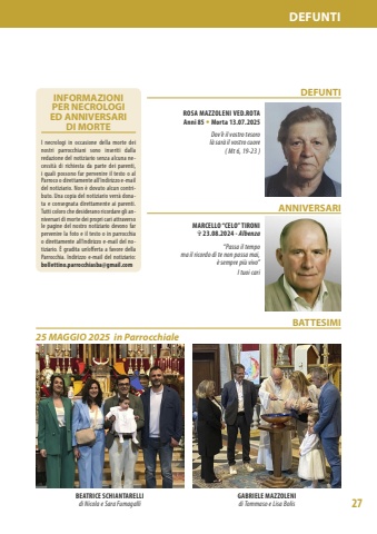 27DEFUNTIROSA MAZZOLENI VED.ROTAAnni 85 %u2022 Morta 13.07.2025 Dov%u2019%u00e8 il vostro tesoro l%u00e0 sar%u00e0 il vostro cuore( Mt 6, 19-23 )DEFUNTIMARCELLO %u201cCELO%u201d TIRONI %u271e 23.08.2024 - Albenza %u201cPassa il tempoma il ricordo di te non passa mai,%u00e8 sempre pi%u00f9 vivo%u201dI tuoi cari ANNIVERSARIBATTESIMI BEATRICE SCHIANTARELLIdi Nicola e Sara FumagalliGABRIELE MAZZOLENIdi Tommaso e Lisa Bolis25 MAGGIO 2025 in Parrocchiale INFORMAZIONI PER NECROLOGI ED ANNIVERSARI DI MORTE I necrologi in occasione della morte dei nostri parrocchiani sono inseriti dalla redazione del notiziario senza alcuna necessit%u00e0 di richiesta da parte dei parenti, i quali possono far pervenire il testo o al Parroco o direttamente all%u2019indirizzo e-mail del notiziario. Non %u00e8 dovuto alcun contributo. Una copia del notiziario verr%u00e0 donata e consegnata direttamente ai parenti. Tutti coloro che desiderano ricordare gli anniversari di morte dei propri cari attraverso le pagine del nostro notiziario devono far pervenire la foto e il testo o in parrocchia o direttamente all%u2019indirizzo e-mail del notiziario. %u00c8 gradita un%u2019offerta a favore della Parrocchia. Indirizzo e-mail del notiziario: bollettino.parrocchiasba@gmail.com
