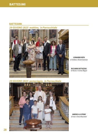 28BATTESIMIBATTESIMI LEONARDO ROTAdi Stefano e Nicole GiarrizzoAMERICA LA SPEME di Ivan e Anna MazzoleniRICCARDO BETTAZZOLIdi Nicola e Cristina Magno29 GIUGNO 2025 mattino, in Parrocchiale 29 GIUGNO 2025 pomeriggio, in Parrocchiale