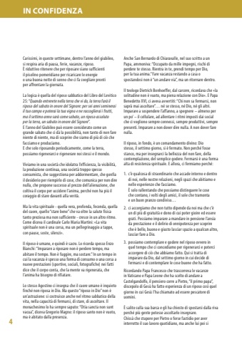IN CONFIDENZA4IN CONFIDENZACarissimi, in queste settimane, dentro l%u2019anno del giubileo, si respira aria di pausa, ferie, vacanze, riposo.%u00c8 riduttivo ritenere che per riposare siano sufficienti il pisolino pomeridiano per ricaricare le energie o una buona notte di sonno che ci fa svegliare pronti per affrontare la giornata.La logica %u00e8 quella del riposo sabbatico del Libro del Levitico 25: %u201cQuando entrerete nella terra che vi do, la terra far%u00e0 il riposo del sabato in onore del Signore: per sei anni seminerai il tuo campo e poterai la tua vigna e ne raccoglierai i frutti, ma il settimo anno sar%u00e0 come sabato, un riposo assoluto per la terra, un sabato in onore del Signore%u201d. E l%u2019anno del Giubileo pu%u00f2 essere considerato come un grande sabato che ci d%u00e0 la possibilit%u00e0, non tanto di non fare niente di niente, ma di scoprire che siamo di pi%u00f9 di ci%u00f2 che facciamo e produciamo. E che solo riposando periodicamente, come la terra, possiamo rigenerarci e rigenerare noi stessi e il mondo.Viviamo in una societ%u00e0 che idolatra l%u2019efficienza, la visibilit%u00e0, la produzione continua, una societ%u00e0 troppo spesso consumista, che suggestiona per addormentare, che gonfia il desiderio per riempirlo di cose, che comunica per non dire nulla, che propone successo al prezzo dell%u2019alienazione, che coltiva il corpo per uccidere l%u2019anima, perch%u00e9 non ha pi%u00f9 il coraggio di stare davanti alla verit%u00e0.Ma la vita spirituale - quella vera, profonda, feconda, quella del cuore, quello %u201cstare bene%u201d che va oltre la salute fisica tanto preziosa ma non sufficiente - cresce in un altro ritmo. Come diceva il cardinale Carlo Maria Martini: %u00abLa vita spirituale non %u00e8 una corsa, ma un pellegrinaggio a tappe, con pause, soste, silenzi%u00bb.Il riposo %u00e8 umano, e quindi %u00e8 sacro. Lo ricorda spesso Enzo Bianchi: %u201cImparare a riposare non %u00e8 perdere tempo, ma abitare il tempo. Non %u00e8 fuggire, ma sostare.%u201d In un tempo in cui la vacanza %u00e8 spesso una forma di consumo o una corsa a nuove prestazioni (sportive, sociali, fotografiche) nei fatti dice che il corpo conta, che la mente va rigenerata, che l%u2019anima ha bisogno di rifiatare.Lo stesso Agostino ci insegna che il cuore umano %u00e8 inquieto finch%u00e9 non riposa in Dio. Ma questo %u201criposo in Dio%u201d non %u00e8 un%u2019astrazione: si costruisce anche nel ritmo sabbatico della vita, nella capacit%u00e0 di fermarsi, di stare, di ascoltare. Il monachesimo lo ha sempre saputo: %u201cOtia sancta non sunt vacua%u201d, diceva Gregorio Magno: il riposo santo non %u00e8 vuoto, ma %u00e8 abitato dalla presenza.Anche San Bernardo di Chiaravalle, nel suo scritto a un Papa, ammoniva: %u201cOccupato da mille impegni, rischi di perdere te stesso. Rientra in te, prendi tempo per Dio, per la tua anima.%u201d Fare vacanza restando a casa o spostandosi non %u00e8 %u201cun andare via%u201d, ma un ritornare dentro.Il teologo Dietrich Bonhoeffer, dal carcere, ricordava che %u00abla solitudine non %u00e8 vuoto, ma piena relazione con Dio%u00bb. E Papa Benedetto XVI, ci aveva avvertiti: %u201cChi non sa fermarsi, non sapr%u00e0 mai ascoltare%u201d%u2026 n%u00e9 se stesso, n%u00e9 Dio, n%u00e9 gli altri. Imparare a sospendere l%u2019affanno, a spegnere %u2013 almeno per un po%u2019 %u2013 il cellulare, ad allentare i ritmi imposti dai social che ci vogliono sempre connessi, sempre produttivi, sempre presenti. Imparare a non dover dire nulla. A non dover fare nulla.Il riposo, in fondo, %u00e8 un comandamento divino: Dio stesso, il settimo giorno, si %u00e8 fermato. Non perch%u00e9 fosse stanco, ma per insegnarci la bellezza del non fare, della contemplazione, del semplice godere. Fermarsi %u00e8 una forma alta di resistenza spirituale. E allora, ci fermiamo perch%u00e9:1.c%u2019%u00e8 qualcosa di straordinario che accade intorno e dentro di noi, nelle nostre relazioni, negli spazi che abitiamo e nelle esperienze che facciamo. %u00c8 solo rallentando che possiamo distinguere le cose che contano, i volti degli amici, il sole che tramonta e un buon pranzo condiviso%u20262.ci accorgiamo che non tutto dipende da noi ma che c%u2019%u00e8 un di pi%u00f9 di gratuit%u00e0 e dono di cui poter gioire ed essere grati. Possiamo imparare a mandare in pensione l%u2019ansia da prestazione e il delirio di onnipotenza per scoprire che %u00e8 bello, buono e giusto lasciar spazio a qualcun altro, lasciar fare a Dio.3.possiamo contemplare e godere nel riposo ovvero in quel tempo che ci concediamo per rigenerarci e poterci accorgere di ci%u00f2 che abbiamo fatto. Qui si tratta di imparare da Dio, dal settimo giorno in cui decide di fermarsi e di contemplare le cose buone che ha fatto.Ricordando Papa Francesco che trascorreva le vacanze in Vaticano e Papa Leone che ha scelto di andare a Castelgandolfo, il pensiero corre a Pietro, %u201cil primo papa%u201d, discepolo di Ges%u00f9 ha fatto esperienza di un riposo cos%u00ec quel giorno in cui Ges%u00f9 l%u2019ha chiamato ad essere pescatore di uomini. %u00c8 salito sulla sua barca e gli ha chiesto di spostarsi dalla riva perch%u00e9 pi%u00f9 gente potesse ascoltarlo insegnare. Chiss%u00e0 che stupore per Pietro o forse fastidio per aver interrotto il suo lavoro quotidiano, ma anche lui poi si
