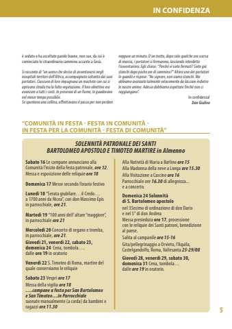 IN CONFIDENZA5SOLENNIT%u00c0 PATRONALE DEI SANTIBARTOLOMEO APOSTOLO E TIMOTEO MARTIRE in AlmennoIN CONFIDENZA%u00e8 seduto e ha ascoltato parole buone, non sue, da cui %u00e8 cominciato lo straordinario cammino accanto a Ges%u00f9.Si racconta di %u201cun uomo che decise di avventurarsi negli inospitali territori dell%u2019Africa, accompagnato soltanto dai suoi portatori. Ciascuno di loro impugnava un machete con cui si aprivano strada tra la folta vegetazione. Il loro obiettivo era avanzare a tutti i costi. In presenza di un fiume, lo guadavano nel minor tempo possibile. Se spuntava una collina, affrettavano il passo per non perdere Sabato 16 Le campane annunciano alla Comunit%u00e0 l%u2019inizio della festa patronale, ore 12.Messa e esposizione delle reliquie ore 18Domenica 17 Messe secondo l%u2019orario festivoLuned%u00ec 18 %u201cSerata giubilare%u2026il Credo%u2026a 1700 anni da Nicea%u201d, con don Massimo Episin parrocchiale, ore 21.Marted%u00ec 19 %u201c100 anni dell%u2019 altare %u201cmaggiore%u201d, in parrocchiale ore 21Mercoled%u00ec 20 Concerto di organo e tromba, in parrocchiale, ore 21.Gioved%u00ec 21, venerd%u00ec 22, sabato 23, domenica 24 Cena, tombola%u2026.dalle ore 19 in oratorio Venerd%u00ec 22 S. Timoteo di Roma, martire del quale conserviamo le reliquie Sabato 23 Vespri ore 17Messa della vigilia ore 18%u2026.campane a festa per San Bartolomeo e San Timoteo%u2026in Parrocchiale suonate manualmente (a corda) da bambini e ragazzi ore 11.30%u201cCOMUNIT%u00c0 IN FESTA - FESTA IN COMUNIT%u00c0 - IN FESTA PER LA COMUNIT%u00c0 - FESTA DI COMUNIT%u00c0%u201dAlla Nativit%u00e0 di Maria a Barlino ore 15Alla Madonna della neve a Longa ore 15.30Alla Visitazione a Cascine ore 16Parrocchiale ore 16.30 di allegrezza...e a concerto.Domenica 24 Solennit%u00e0 di S. Bartolomeo apostolonel 35esimo di ordinazione di don Dario e nel 5%u00b0 di don AndreaMessa presieduta ore 17, processione con le reliquie dei Santi patroni, benedizione al paese.Salita al campanile ore 15-16Gita/pellegrinaggio a Orvieto, l%u2019Aquila, Castelgandolfo, Roma, Vallesanta 25-29/08Gioved%u00ec 28, venerd%u00ec 29, sabato 30, domenica 31 Cena, tombola%u2026 dalle ore 19 in oratorio.neppure un minuto. D%u2019un tratto, dopo solo qualche ora scarsa di marcia, i portatori si fermarono, lasciando interdetto l%u2019avventuriero. Egli chiese: %u201cPerch%u00e9 vi siete fermati? Siete gi%u00e0 stanchi dopo poche ore di cammino?%u201d Allora uno dei portatori lo guard%u00f2 e rispose: %u201cNo signore, non siamo stanchi. Ma abbiamo avanzato talmente velocemente da lasciare indietro le nostre anime. Adesso dobbiamo aspettare finch%u00e9 non ci raggiungano%u201d.In confidenza!Don Giulivo