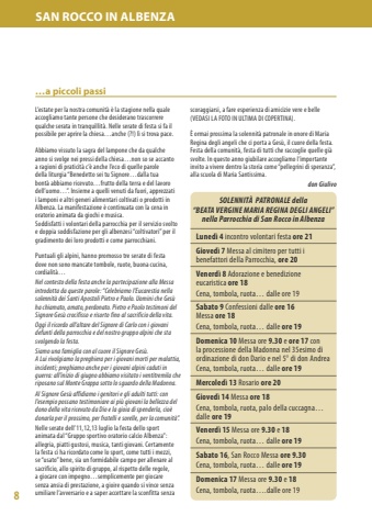 8SAN ROCCO IN ALBENZA scoraggiarsi, a fare esperienza di amicizie vere e belle(VEDASI LA FOTO IN ULTIMA DI COPERTINA).%u00c8 ormai prossima la solennit%u00e0 patronale in onore di Maria Regina degli angeli che ci porta a Ges%u00f9, il cuore della festa. Festa della comunit%u00e0, festa di tutti che raccoglie quelle gi%u00e0 svolte. In questo anno giubilare accogliamo l%u2019importante invito a vivere dentro la storia come %u201cpellegrini di speranza%u201d, alla scuola di Maria Santissima.don Giulivo L%u2019estate per la nostra comunit%u00e0 %u00e8 la stagione nella quale accogliamo tante persone che desiderano trascorrere qualche serata in tranquillit%u00e0. Nelle serate di festa si fa il possibile per aprire la chiesa%u2026anche (?!) l%u00ec si trova pace.Abbiamo vissuto la sagra del lampone che da qualche anno si svolge nei pressi della chiesa%u2026non so se accanto a ragioni di praticit%u00e0 c%u2019%u00e8 anche l%u2019eco di quelle parole della liturgia %u201cBenedetto sei tu Signore%u2026dalla tua bont%u00e0 abbiamo ricevuto%u2026frutto della terra e del lavoro dell%u2019uomo%u2026%u201d. Insieme a quelli venuti da fuori, apprezzati i lamponi e altri generi alimentari coltivati o prodotti in Albenza. La manifestazione %u00e8 continuata con la cena in oratorio animata da giochi e musica. Soddisfatti i volontari della parrocchia per il servizio svolto e doppia soddisfazione per gli albenzesi %u201ccoltivatori%u201d per il gradimento dei loro prodotti e come parrocchiani.Puntuali gli alpini, hanno promosso tre serate di festa dove non sono mancate tombole, ruote, buona cucina, cordialit%u00e0%u2026Nel contesto della festa anche la partecipazione alla Messa introdotta da queste parole: %u201cCelebriamo l%u2019Eucarestia nella solennit%u00e0 dei Santi Apostoli Pietro e Paolo. Uomini che Ges%u00f9 ha chiamato, amato, perdonato. Pietro e Paolo testimoni del Signore Ges%u00f9 crocifisso e risorto fino al sacrificio della vita.Oggi il ricordo all%u2019altare del Signore di Carlo con i giovani defunti della parrocchia e del nostro gruppo alpini che sta svolgendo la festa.Siamo una famiglia con al cuore il Signore Ges%u00f9. A Lui rivolgiamo la preghiera per i giovani morti per malattia, incidenti; preghiamo anche per i giovani alpini caduti in guerra: all%u2019inizio di giugno abbiamo visitato i ventitremila che riposano sul Monte Grappa sotto lo sguardo della Madonna.Al Signore Ges%u00f9 affidiamo i genitori e gli adulti tutti: con l%u2019esempio possano testimoniare ai pi%u00f9 giovani la bellezza del dono della vita ricevuto da Dio e la gioia di spenderla, cio%u00e8 donarla per il prossimo, per fratelli e sorelle, per la comunit%u00e0%u201d.Nelle serate dell%u201911,12,13 luglio la festa dello sport animata dal %u201cGruppo sportivo oratorio calcio Albenza%u201d: allegria, piatti gustosi, musica, tanti giovani. Certamente la festa ci ha ricordato come lo sport, come tutti i mezzi, se %u201cusato%u201d bene, sia un formidabile campo per allenare al sacrificio, allo spirito di gruppo, al rispetto delle regole, a giocare con impegno%u2026semplicemente per giocare senza ansia di prestazione, a gioire quando si vince senza umiliare l%u2019avversario e a saper accettare la sconfitta senza %u2026a piccoli passiLuned%u00ec 4 incontro volontari festa ore 21Gioved%u00ec 7 Messa al cimitero per tutti i benefattori della Parrocchia, ore 20Venerd%u00ec 8 Adorazione e benedizione eucaristica ore 18Cena, tombola, ruota%u2026 dalle ore 19Sabato 9 Confessioni dalle ore 16Messa ore 18Cena, tombola, ruota%u2026 dalle ore 19Domenica 10 Messa ore 9.30 e ore 17 con la processione della Madonna nel 35esimo di ordinazione di don Dario e nel 5%u00b0 di don AndreaCena, tombola, ruota%u2026 dalle ore 19Mercoled%u00ec 13 Rosario ore 20Gioved%u00ec 14 Messa ore 18Cena, tombola, ruota, palo della cuccagna%u2026 dalle ore 19Venerd%u00ec 15 Messa ore 9.30 e 18Cena, tombola, ruota%u2026 dalle ore 19Sabato 16, San Rocco Messa ore 9.30Cena, tombola, ruota%u2026 dalle ore 19Domenica 17 Messa ore 9.30 e 18Cena, tombola, ruota%u2026.dalle ore 19SOLENNIT%u00c0 PATRONALE della %u201cBEATA VERGINE MARIA REGINA DEGLI ANGELI%u201dnella Parrocchia di San Rocco in Albenza