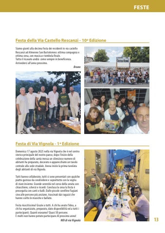 13FESTE Siamo giunti alla decima festa dei residenti in via castello Rescanzi ad Almenno San Bartolomeo: ottima compagnia e ottima cena, con musica e tombola finale.Tutto il ricavato andr%u00e0 come sempre in beneficenza.Arrivederci all%u2019anno prossimo.BrunoDomenica 17 agosto 2025 nella via Vignola che %u00e8 nel centro storico principale del nostro paese, dopo l%u2019inizio della celebrazione della santa messa un silenzioso numero di abitanti ha preparato, decorato e apparecchiato un tavolo centrale alla sede stradale. Aveva inizio la prima tavolata degli abitanti di via Vignola. Tutti hanno collaborato, tutti si sono presentati con qualche piatto gustoso da condividere e soprattutto con la voglia di stare insieme. Grande serenit%u00e0 nel corso della serata con chiacchiere, scherzi e ricordi. Conclusa la cena la festa %u00e8 proseguita con canti e balli. Dalle piccole sorelline Fagiani sino alle persone pi%u00f9 anziane, trascinati dai ragazzi che hanno scelto le musiche e ballato.Festa riuscitissima! Grazie a tutti. A chi ha avuto l%u2019idea, a chi ha organizzato, preparato, dato disponibilit%u00e0 ed a tutti i partecipanti. Quanti eravamo? Quasi 50 persone. E molti non hanno potuto partecipare.Al prossimo anno!NOI di via VignolaFesta della Via Castello Rescanzi - 10%u00aa Edizione Festa di Via Vignola - 1%u00aa Edizione