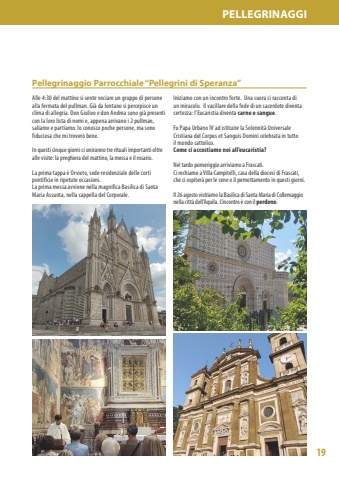 19PELLEGRINAGGIAlle 4:30 del mattino si sente vociare un gruppo di persone alla fermata del pullman. Gi%u00e0 da lontano si percepisce un clima di allegria. Don Giulivo e don Andrea sono gi%u00e0 presenti con la loro lista di nomi e, appena arrivano i 2 pullman, saliamo e partiamo. Io conosco poche persone, ma sono fiduciosa che mi trover%u00f2 bene.In questi cinque giorni ci uniranno tre rituali importanti oltre alle visite: la preghiera del mattino, la messa e il rosario.La prima tappa %u00e8 Orvieto, sede residenziale delle corti pontificie in ripetute occasioni. La prima messa avviene nella magnifica Basilica di Santa Maria Assunta, nella cappella del Corporale. Pellegrinaggio Parrocchiale %u201cPellegrini di Speranza%u201dIniziamo con un incontro forte. Una suora ci racconta di un miracolo. Il vacillare della fede di un sacerdote diventa certezza: l%u2019Eucaristia diventa carne e sangue.Fu Papa Urbano IV ad istituire la Solennit%u00e0 Universale Cristiana del Corpus et Sanguis Domini celebrata in tutto il mondo cattolico.Come ci accostiamo noi all%u2019eucaristia?Nel tardo pomeriggio arriviamo a Frascati.Ci rechiamo a Villa Campitelli, casa della diocesi di Frascati, che ci ospiter%u00e0 per le cene e il pernottamento in questi giorni.Il 26 agosto visitiamo la Basilica di Santa Maria di Collemaggio nella citt%u00e0 dell%u2019Aquila. L%u2019incontro %u00e8 con il perdono.