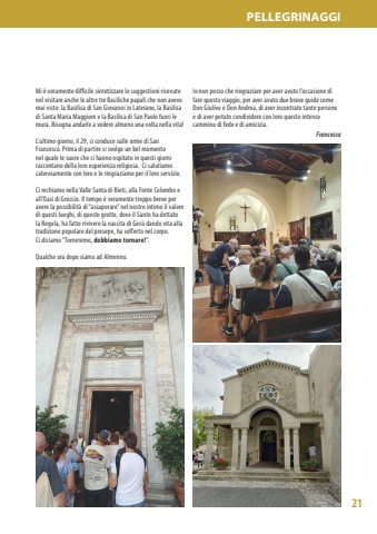 21PELLEGRINAGGI Mi %u00e8 veramente difficile sintetizzare le suggestioni ricevute nel visitare anche le altre tre Basiliche papali che non avevo mai visto: la Basilica di San Giovanni in Laterano, la Basilica di Santa Maria Maggiore e la Basilica di San Paolo fuori le mura. Bisogna andarle a vedere almeno una volta nella vita! L%u2019ultimo giorno, il 29, ci conduce sulle orme di San Francesco. Prima di partire si svolge un bel momento nel quale le suore che ci hanno ospitato in questi giorni raccontano della loro esperienza religiosa. Ci salutiamo calorosamente con loro e le ringraziamo per il loro servizio.Ci rechiamo nella Valle Santa di Rieti, alla Fonte Colombo e all%u2019Oasi di Greccio. Il tempo %u00e8 veramente troppo breve per avere la possibilit%u00e0 di %u201cassaporare%u201d nel nostro intimo il valore di questi luoghi, di queste grotte, dove il Santo ha dettato la Regola, ha fatto rivivere la nascita di Ges%u00f9 dando vita alla tradizione popolare del presepe, ha sofferto nel corpo.Ci diciamo %u201cTorneremo, dobbiamo tornare!%u201d.Qualche ora dopo siamo ad Almenno.Io non posso che ringraziare per aver avuto l%u2019occasione di fare questo viaggio, per aver avuto due brave guide come Don Giulivo e Don Andrea, di aver incontrato tante persone e di aver potuto condividere con loro questo intenso cammino di fede e di amicizia.Francesca