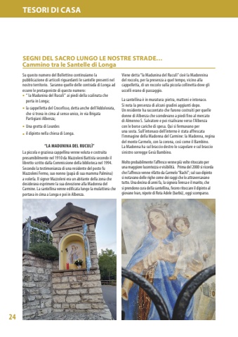 24TESORI DI CASA Su questo numero del Bollettino continuiamo la pubblicazione di articoli riguardanti le santelle presenti nel nostro territorio. Saranno quelle delle contrada di Longa ad essere le protagoniste di questo numero: %u2022%u201c la Madunina del Rucul%u00ec%u201d ai piedi della scalinata che porta in Longa;%u2022la cappelletta del Crocefisso, detta anche dell%u2019Addolorata, che si trova in cima al senso unico, in via Brigata Partigiani Albenza;%u2022Una grotta di Lourdes %u2022il dipinto nella chiesa di Longa.%u201cLA MADUNINA DEL RUCUL%u00cc%u201dLa piccola e graziosa cappellina venne voluta e costruita presumibilmente nel 1910 da Mazzoleni Battista secondo il libretto scritto dalla Commissione della biblioteca nel 1994. Secondo la testimonianza di una residente del posto fu Mazzoleni Fermo, suo nonno (pap%u00e0 di sua mamma Palmina) a volerla. Il signor Mazzoleni era un abitante della zona che desiderava esprimere la sua devozione alla Madonna del Carmine. La santellina venne edificata lungo la mulattiera che portava in cima a Longa e poi in Albenza.Viene detta %u201cla Madunina del Rucul%u00ec%u201d cio%u00e8 la Madonnina del roccolo, per la presenza a quel tempo, vicino alla cappelletta, di un roccolo sulla piccola collinetta dove gli uccelli erano di passaggio. La santellina %u00e8 in muratura: pietra, mattoni e intonaco. Si nota la presenza di alcuni gradini aggiunti dopo.Un residente ha raccontato che furono costruiti per quelle donne di Albenza che scendevano a piedi fino al mercato di Almenno S. Salvatore e poi risalivano verso l%u2019Albenza con le borse cariche di spesa. Qui si fermavano per una sosta. Sull%u2019intonaco dell%u2019interno %u00e8 stata affrescata l%u2019immagine della Madonna del Carmine: la Madonna, regina del monte Carmelo, con la corona, cos%u00ec come il Bambino. La Madonna ha sul braccio destro lo scapolare e sul braccio sinistro sorregge Ges%u00f9 Bambino.Molto probabilmente l%u2019affresco venne pi%u00f9 volte ritoccato per una maggiore lucentezza e visibilit%u00e0. Prima del 2000 si ricorda che l%u2019affresco venne rifatto da Carmelo %u201cBach%u00ec%u201d; sul suo dipinto si notavano delle righe come dei raggi che lo attraversavano tutto. Una decina di anni fa, la signora Teresa e il marito, che si prendono cura della santellina, fecero ritoccare il dipinto al giovane Ivan, nipote di Rota Adele (barb%u00f9), oggi scomparso.SEGNI DEL SACRO LUNGO LE NOSTRE STRADE%u2026Cammino tra le Santelle di Longa