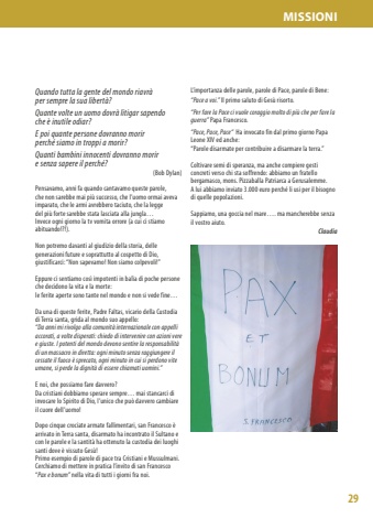 29MISSIONIQuando tutta la gente del mondo riavr%u00e0 per sempre la sua libert%u00e0?Quante volte un uomo dovr%u00e0 litigar sapendo che %u00e8 inutile odiar?E poi quante persone dovranno morir perch%u00e9 siamo in troppi a morir?Quanti bambini innocenti dovranno morir e senza sapere il perch%u00e9?(Bob Dylan)Pensavamo, anni fa quando cantavamo queste parole, che non sarebbe mai pi%u00f9 successo, che l%u2019uomo ormai aveva imparato, che le armi avrebbero taciuto, che la legge del pi%u00f9 forte sarebbe stata lasciata alla jungla%u2026Invece ogni giorno la tv vomita orrore (a cui ci stiamo abituando!?!).Non potremo davanti al giudizio della storia, delle generazioni future e soprattutto al cospetto di Dio, giustificarci: %u201cNon sapevamo! Non siamo colpevoli!%u201d Eppure ci sentiamo cos%u00ec impotenti in bal%u00eca di poche persone che decidono la vita e la morte:le ferite aperte sono tante nel mondo e non si vede fine%u2026Da una di queste ferite, Padre Faltas, vicario della Custodia di Terra santa, grida al mondo suo appello:%u201cDa anni mi rivolgo alla comunit%u00e0 internazionale con appelli accorati, a volte disperati: chiedo di intervenire con azioni vere e giuste. I potenti del mondo devono sentire la responsabilit%u00e0 di un massacro in diretta: ogni minuto senza raggiungere il cessate il fuoco %u00e8 sprecato, ogni minuto in cui si perdono vite umane, si perde la dignit%u00e0 di essere chiamati uomini.%u201dE noi, che possiamo fare davvero? Da cristiani dobbiamo sperare sempre%u2026 mai stancarci di invocare lo Spirito di Dio, l%u2019unico che pu%u00f2 davvero cambiare il cuore dell%u2019uomo!Dopo cinque crociate armate fallimentari, san Francesco %u00e8 arrivato in Terra santa, disarmato ha incontrato il Sultano e con le parole e la santit%u00e0 ha ottenuto la custodia dei luoghi santi dove %u00e8 vissuto Ges%u00f9! Primo esempio di parole di pace tra Cristiani e Mussulmani. Cerchiamo di mettere in pratica l%u2019invito di san Francesco %u201cPax e bonum%u201d nella vita di tutti i giorni fra noi. L%u2019importanza delle parole, parole di Pace, parole di Bene:%u201cPace a voi.%u201d Il primo saluto di Ges%u00f9 risorto.%u201cPer fare la Pace ci vuole coraggio molto di pi%u00f9 che per fare la guerra%u201d Papa Francesco.%u201cPace, Pace, Pace%u201c Ha invocato fin dal primo giorno Papa Leone XIV ed anche:%u201cParole disarmate per contribuire a disarmare la terra.%u201d Coltivare semi di speranza, ma anche compiere gesti concreti verso chi sta soffrendo: abbiamo un fratello bergamasco, mons. Pizzaballa Patriarca a Gerusalemme.A lui abbiamo inviato 3.000 euro perch%u00e9 li usi per il bisogno di quelle popolazioni. Sappiamo, una goccia nel mare%u2026. ma mancherebbe senza il vostro aiuto.Claudia
