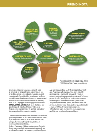 3PRENDI NOTADOMENICA 26/10Anniversario Dedicazione della parrocchiale diS. Bartolomeo (28/10/1861) Domenica 19 OTTOBRE 99a Giornata missionaria mondiale DA SABATO 27 eDOMENICA 28/9 Catechesi iniziazione cristiana IL MERCOLED%u00cc 16.30 Messa al Cimitero di AlbenzaIL MARTED%u00ccore 16.30 Messa al Cimitero S. Bartolomeo 19 OTTOBRECastagnata a San Bartolomeo 7-14-21 OTTOBREore 20.30 Primi passi del nuovo anno pastorale 12 OTTOBRE Castagnata in Albenza DOMENICA 19/10Anniversario Dedicazione della parrocchiale di S. Rocco (18/10/1864) *AGGIORNAMENTI SUL FOGLIO DEGLI AVVISI E SITO PARROCCHIALE www.parrocchiasb.itoggi sono stato derubato. So che devo ringraziarti per molte cose. Per prima cosa ti ringrazio di non essere mai stato rapinato prima, e in un mondo come questo %u00e8 quasi un miracolo. In secondo luogo voglio dirti grazie perch%u00e9 mi hanno portato via solo il portafoglio che, come sempre, conteneva solamente pochi soldi e una vecchia borsa piena di carta. Ti voglio ringraziare anche, Signore, perch%u00e9 non c%u2019erano con me mia moglie e mia figlia, che si sarebbero spaventate molto e anche per il fatto che ora non piangono per me. Infine, Signore, voglio ringraziarti in un modo particolare, perch%u00e9 io sono stato il derubato e non il ladro%u00bb.Stiamo per entrare nel nuovo anno pastorale quasi al termine di un tempo estivo nel quale il Signore non ci ha abbandonato, non %u00e8 andato in vacanza e con Lui il cammino delle Comunit%u00e0 di San Bartolomeo e San Rocco non si %u00e8 fermato. I mesi trascorsi sono stati segnati da tanti momenti di festa che hanno toccato il nostro territorio, oltre al Cre, campeggio, Pellegrinaggi giubilari, concerti... GRAZIE, GRAZIE, GRAZIE a tutti coloro che hanno reso possibile queste iniziative. Il Signore Vi benedica! Mi piacerebbe ringraziarvi con %u201clo spirito di gratitudine%u201d del protagonista della storia che condivido.%u201cIl professor Matthew Henry stava rincasando dall%u2019Universit%u00e0, quando a pochi metri da casa sua si trov%u00f2 davanti una canna di pistola puntata contro gli occhi. Dietro la pistola c%u2019era un rapinatore con il volto coperto che gli intim%u00f2 di consegnargli borsa e portafoglio. Lo fece e il rapinatore si dilegu%u00f2 rapidamente nell%u2019oscurit%u00e0. Ancora spaventato dalla spiacevole esperienza, quella sera si sedette alla scrivania e scrisse questa preghiera: %u00abSignore,