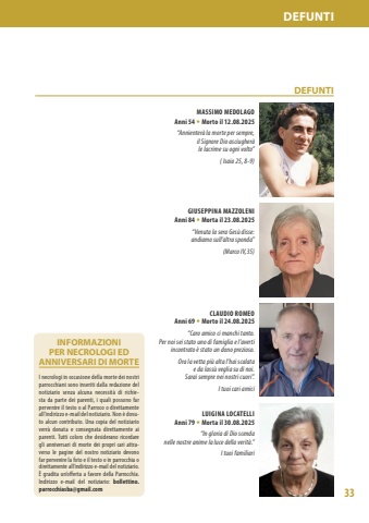 33DEFUNTI DEFUNTI MASSIMO MEDOLAGO Anni 54 %u2022 Morto il 12.08.2025 %u201cAnnienter%u00e0 la morte per sempre,il Signore Dio asciugher%u00e0 le lacrime su ogni volto%u201d ( Isaia 25, 8-9)GIUSEPPINA MAZZOLENI Anni 84 %u2022 Morta il 23.08.2025 %u201cVenuta la sera Ges%u00f9 disse: andiamo sull%u2019altra sponda%u201d(Marco IV,35)CLAUDIO ROMEO Anni 69 %u2022 Morto il 24.08.2025%u201cCaro amico ci manchi tanto. Per noi sei stato uno di famiglia e l%u2019averti incontrato %u00e8 stato un dono prezioso.Ora la vetta pi%u00f9 alta l%u2019hai scalata e da lass%u00f9 veglia su di noi. Sarai sempre nei nostri cuori%u201d.I tuoi cari amici LUIGINA LOCATELLI Anni 79 %u2022 Morta il 30.08.2025 %u201cIn gloria di Dio scenda nelle nostre anime la luce della verit%u00e0.%u201dI tuoi familiariINFORMAZIONI PER NECROLOGI ED ANNIVERSARI DI MORTE I necrologi in occasione della morte dei nostri parrocchiani sono inseriti dalla redazione del notiziario senza alcuna necessit%u00e0 di richiesta da parte dei parenti, i quali possono far pervenire il testo o al Parroco o direttamente all%u2019indirizzo e-mail del notiziario. Non %u00e8 dovuto alcun contributo. Una copia del notiziario verr%u00e0 donata e consegnata direttamente ai parenti. Tutti coloro che desiderano ricordare gli anniversari di morte dei propri cari attraverso le pagine del nostro notiziario devono far pervenire la foto e il testo o in parrocchia o direttamente all%u2019indirizzo e-mail del notiziario. %u00c8 gradita un%u2019offerta a favore della Parrocchia. Indirizzo e-mail del notiziario: bollettino.parrocchiasba@gmail.com