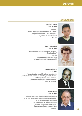 35DEFUNTI LOCATELLI PAOLO%u271e 23.09.1999ANTONIO CURIAZZI%u271e 23.09.2021LUIGI CAPELLI %u271e 06.08.2024 %u201cCaro Paolo,non ci si abitua all%u2019assenza delle persone che si amano. Si impara a sopravvivere %u2026 ma %u00e8 un%u2019altra cosa.Ringraziamo chi ancora lo ricorda%u201dI tuoi cari%u201c Vivere nel cuore di chi resta vuol dire non morire mai.Ti vogliamo bene %u201cI tuoi cari(Ti ricorderemo con il pap%u00e0 alla S. Messa di sabato 11 ottobre ore 16.30 in parrocchiale)%u201cLa grandezza di un uomo %u00e8 fatta di cose semplici e vere; %u00e8 fatta di valori e di coerenza, ma anche di impegno e di altruismo.%u00c8 fatta soprattutto di amore, amore vero.Rimarr%u00e0 per sempre in noi la luce del suo esempio,la luce del suo amore%u201d.%u00c8 passato un anno, eppure ci sembra di vederti ancora seduto al tuo solito posto, con quel modo tutto tuo di stare in silenzio.La tua assenza %u00e8 una presenza costante che ci accompagna con dolcezza e nostalgia.Ci consola solo il pensiero di averti avuto, di averti amato e di essere stati amati da te.I tuoi cari.ANNIVERSARIANGELA %u2018NIN%u00cc%u2019 ROSSI %u271e 14.10.2016