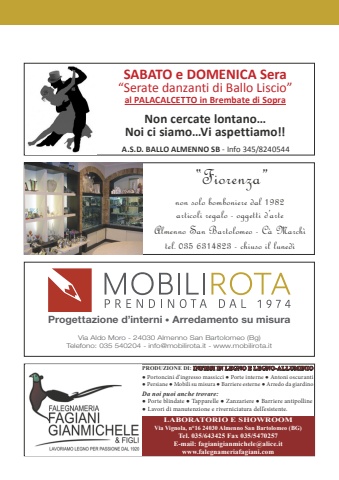 %u201cFiorenza%u201dnon solo bomboniere dal 1982articoli regalo - oggetti d%u2019arteAlmenno San Bartolomeo - C%u00e0 March%u00ectel. 035 6314823 - chiuso il luned%u00ecPRODUZIONE DI: INFISSI IN LEGNO E LEGNO-ALLUMINIO%u25cf Portoncini d%u2019ingresso massicci %u25cf Porte interne %u25cf Antoni oscuranti %u25cfPersiane %u25cf Mobili su misura %u25cf Barriere esterne %u25cf Arredo da giardinoDa noi puoi anche trovare:%u25cf Porte blindate %u25cf Tapparelle %u25cf Zanzariere %u25cf Barriere antipolline %u25cf Lavori di manutenzione e riverniciatura dell%u2019esistente.LABORATORIO E SHOWROOMVia Vignola, n%u00b016 24030 Almenno San Bartolomeo (BG)Tel. 035/643425 Fax 035/5470257E-mail: fagianigianmichele@alice.itwww.falegnameriafagiani.comSABATO e DOMENICA Sera %u201cSerate danzanti di Ballo Liscio%u201dal PALACALCETTO in Brembate di SopraNon cercate lontano%u2026Noi ci siamo%u2026Vi aspettiamo!!Via Aldo Moro - 24030 Almenno San Bartolomeo (Bg)Telefono: 035 540204 - info@mobilirota.it - www.mobilirota.itProgettazione d%u2019interni %u2022 Arredamento su misuraA.S.D. BALLO ALMENNO SB - Info 345/8240544