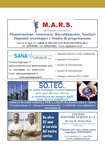 La nostra tecnologia, il nostro impegnoper purificare l%u2019ariae restituire ai nostri figliuna terra miglioreIMPIANTI INDUSTRIALI PER LA DEPURAZIONE DELL%u2019 ARIAVia Castel Gandosso, 15 - Almenno San Bartolomeo (BG) - Tel. 035553196 - Email:info@sotec.itwww.sotec.itManutenzione, Assistenza, Riscaldamento, SanitariImpianti tecnologici e Studio di progettazioneVia Ca%u2019 d%u2019Agri, 27 - 24030 ALMENNO SAN BARTOLOMEO (BG)Tel.: 035549106 - Fax: 0356312053 - Email: info@mars-srl.itVia Torre degli Agri, 7124030 ALMENNO SAN BARTOLOMEO (BG)Tel. : 035549606 - Fax : 0356312179Email : info@sanaimpianti.itwww.sanaimpianti.it%u25b6Impianti Elettrici Civili e Industriali%u25b6Impianti Fotovoltaici%u25b6Quadri di Distribuzione%u25b6Quadri di Automazione%u25b6Sviluppo software PLC e HMIChiama per una visita senza impegno: 035545693Via Campofiori, 37 - Alm%u00e8 (BG)www.studiosfriso.itDir. San. Dr. Matteo SfrisoDottore in Odontoiatria e Protesi DentariaOdontoiatraSTUDIO Da oltreDOTTORI SFRISO S.r.l.35 annial serviziodel vostrosorriso