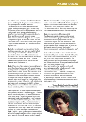 IN CONFIDENZA5IN CONFIDENZAdi tentare. Gli amici studiano insieme, pregano insieme, si aiutano a vicenda e si divertono molto. Portano i pesi gli uni degli altri. Questo %u00e8 il mio comandamento, che i miei amici, i miei fratelli si amino gli uni gli altri come io li amo. %u00c8 un grande dono l%u2019amicizia bella, libera, operosa, che aiuta e incoraggia ciascuno a vivere la sua vita come vocazione.Carlo: Sono impressionato dalla mia popolarit%u00e0. Vedo dappertutto segni di attenzione, accolgo da molti pensieri di ammirazione e preghiere. C%u2019%u00e8 molta gente che viene nel Santuario della Spogliazione in Assisi dove %u00e8 custodito il mio corpo. Ci sono molti che intitolano al mio nome strutture per i giovani e mettono nelle cappelle una mia foto. Eppure io non ho combinato niente, ho vissuto poco. Non ho avuto neppure il tempo di %u201cfare il malato%u201d. Come si spiega questa mia popolarit%u00e0. Servir%u00e0 a qualche cosa?Ges%u00f9: I santi rendono bella la Chiesa e rendono attraente la via della santit%u00e0 perch%u00e9 diventano strumento dello Spirito Santo: alcuni hanno scritto intere biblioteche, altri poche frasi, alcuni hanno compiuto opere straordinarie, altri hanno vissuto vite ordinarie, alcuni hanno vissuto lunghi anni di lavoro intensissimo, altri sono stati malati per lunghi anni e %u201cnon hanno combinato niente%u201d. Ecco, i santi con la loro vita, con le loro parole, con la loro preghiera possono fare molto bene a molti o anche scomparire, confusi nella moltitudine. Tutti edificano la Chiesa. La popolarit%u00e0 e la simpatia che ti circondano sono opera dello Spirito e di te si servir%u00e0 lo Spirito di Dio per attirare molti alla conversione, all%u2019imitazione, alla intuizione che anche a quindici anni %u00e8 affascinante e fonte di gioia immensa pregare molto, amare molto, sognare molto.( %u201cAcutis e Ges%u00f9, indiscrezioni di un%u2019amicizia%u201d, di monsignor Mario DELPINI Arcivescovo di Milano.)non vedono i poveri. Si abituano all%u2019indifferenza e trovano persino di cattivo gusto che qualcuno chieda qualche cosa. %u00c8 un grande pericolo la ricchezza che acceca.C%u2019%u00e8 speranza per i ricchi? Quello che %u00e8 impossibile agli uomini, non %u00e8 impossibile a Dio. Tutto %u00e8 possibile a Dio. Chi ha molte ricchezze pu%u00f2 fare del bene a molti, se si lascia condurre dallo Spirito Santo a condividere, aiutare, a trafficare i suoi talenti perch%u00e9 siano a servizio di molti. Chi sa fare il bene e non lo fa commette peccato. Ma se anche il ragazzo ricco e il ragazzo sano e il ragazzo intelligente e il ragazzo amabile dedica tempo, usa i suoi soldi, semina sorrisi e sente la compassione, allora i poveri che pu%u00f2 aiutare lo benedicono. Chi %u00e8 benedetto dai poveri %u00e8 gradito a Dio.Carlo: Cos%u00ec breve %u00e8 stata la mia vita sulla terra! Non ho combinato un gran che: sono stato forse inutile? Se fossi vissuto a lungo avrei potuto fare molto bene a molte persone. Chi sa? Forse avrei potuto consacrarmi a una missione di carit%u00e0, forse avrei potuto formare una famiglia di affetti intensi e di amore vero. Forse%u2026 La morte prematura ha fatto soffrire molto i miei cari. Perch%u00e9 la malattia, perch%u00e9 l%u2019ingiusta morte?Ges%u00f9: Il Padre mio e Padre vostro non ha orrore della morte e non l%u2019ha voluta, n%u00e9 la tua morte, n%u00e9 la morte di nessuno. Perch%u00e9 questa %u00e8 la volont%u00e0 del Padre, che tutti siano salvati.Ma nessuna vita %u00e8 inutile. Il valore di una vita non si misura per il numero degli anni, ma per l%u2019intensit%u00e0 dell%u2019amore e la sincerit%u00e0 della fede. La malattia e la morte non vengono da Dio, non sono volont%u00e0 di Dio: piuttosto il Padre mio manda lo Spirito perch%u00e9 in ogni cosa i figli e le figlie di Dio possano credere e amare. Nella salute o nella malattia, nella giovinezza o nella vecchiaia, nei giorni belli e nei giorni brutti, nelle case povere e nelle case ricche quello che conta %u00e8 vivere come Ges%u00f9, praticare il suo comandamento.Carlo: Signore Ges%u00f9, per breve tempo tu mi hai dato grandi doni. Dicevano di me anche: %u00abSei un bel ragazzo!%u00bb. La bellezza attira lo sguardo delle ragazze e dei ragazzi. %u00c8 bello essere notati, essere cercati. %u00c8 anche imbarazzante. Non ho avuto esperienza di grandi amori: troppo breve %u00e8 stata la mia vita. Ho sentito il fascino dell%u2019amicizia semplice, pulita, quella che aiuta a essere migliori e anch%u2019io, per come sono riuscito, ho cercato di essere un amico che aiuta a diventare migliori.Nel fiore dell%u2019et%u00e0 ho lasciato la vita precaria per entrare nel compimento della gloria. Mi piacerebbe per%u00f2 aiutare quelli della mia et%u00e0 a vivere amicizie per diventare migliori.Ges%u00f9: L%u2019amicizia %u00e8 vera se aiuta sempre a diventare migliori: gli amici si incoraggiano al bene, insieme possono compiere opere buone che ciascuno da solo non avrebbe il coraggio