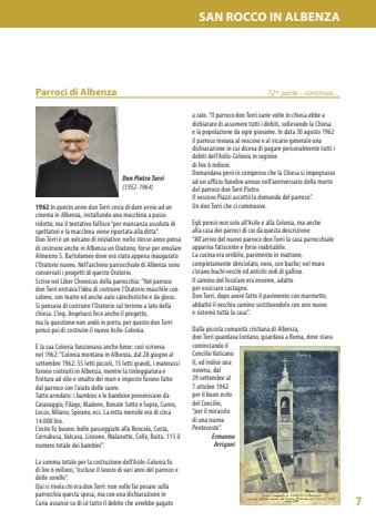 7SAN ROCCO IN ALBENZA a rate. %u201cIl parroco don Torri varie volte in chiesa ebbe a dichiarare di assumere tutti i debiti, sollevando la Chiesa e la popolazione da ogni gravame. In data 30 agosto 1962 il parroco inviava al vescovo e al vicario generale una dichiarazione in cui diceva di pagare personalmente tutti i debiti dell%u2019Asilo-Colonia in ragione di lire 6 milioni. Domandava per%u00f2 in compenso che la Chiesa si impegnasse ad un ufficio funebre annuo nell%u2019anniversario della morte del parroco don Torri Pietro. Il vescovo Piazzi accett%u00f2 la domanda del parroco%u201d. Un don Torri che ci commuove.Egli pens%u00f2 non solo all%u2019Asilo e alla Colonia, ma anche alla casa dei parroci di cui d%u00e0 questa descrizione: %u201cAll%u2019arrivo del nuovo parroco don Torri la casa parrocchiale appariva fatiscente e forse inabitabile. La cucina era orribile, pavimento in mattone, completamente sbriciolato, nero, con buche; nel muro c%u2019erano buchi vecchi ed antichi nidi di galline. Il camino del focolare era enorme, adattoper essiccare castagne. Don Torri, dopo avere fatto il pavimento con marmette, abbatt%u00e9 il vecchio camino sostituendolo con uno nuovo e sistem%u00f2 tutta la casa%u201d. Dalla piccola comunit%u00e0 cristiana di Albenza, don Torri guardava lontano, guardava a Roma, dove stava cominciando il Concilio Vaticano II, ed indice una novena, dal 29 settembre al 7 ottobre 1962 per il buon esito del Concilio, %u201cper il miracolo di una nuova Pentecoste%u201d.Ermanno Arrigoni 1962 In questo anno don Torri cerca di dare avvio ad un cinema in Albenza, installando una macchina a passo ridotto; ma il tentativo fallisce %u201cper mancanza assoluta di spettatori e la macchina viene riportata alla ditta%u201d. Don Torri %u00e8 un vulcano di iniziative: nello stesso anno pensa di costruire anche in Albenza un Oratorio, forse per emulare Almenno S. Bartolomeo dove era stato appena inaugurato l%u2019Oratorio nuovo. Nell%u2019archivio parrocchiale di Albenza sono conservati i progetti di questo Oratorio. Scrive nel Liber Chronicus della parrocchia: %u201cNel parroco don Torri entrava l%u2019idea di costruire l%u2019Oratorio maschile con salone, con teatro ed anche aule catechistiche e da gioco. Si pensava di costruire l%u2019Oratorio sul terreno a lato della chiesa. L%u2019ing. Angelucci fece anche il progetto, ma la questione non and%u00f2 in porto, per questo don Torri pens%u00f2 poi di costruire il nuovo Asilo-Colonia.E la sua Colonia funzionava anche bene: cos%u00ec scriveva nel 1962: %u201cColonia montana in Albenza, dal 28 giugno al settembre 1962: 55 letti piccoli, 15 letti grandi, i materassi furono costruiti in Albenza, mentre la tinteggiatura e finitura ad olio e smalto dei muri e imposte furono fatte dal parroco con l%u2019aiuto delle suore. Tutto arredato: i bambini e le bambine provenivano da Caravaggio, Filago, Madone, Bonate Sotto e Sopra, Curno, Lecco, Milano, Spirano, ecc. La retta mensile era di circa 14.000 lire. L%u2019esito fu buono: belle passeggiate alla Roncola, Costa, Cornabusa, Valcava, Linzone, Malanotte, Colle, Baita. 115 il numero totale dei bambini%u201d.La somma totale per la costruzione dell%u2019Asilo-Colonia fu di lire 6 milioni, %u201cescluso il lavoro di vari anni del parroco e delle sorelle%u201d. Qui si rivela chi era don Torri: non volle far pesare sulla parrocchia questa spesa, ma con una dichiarazione in Curia assunse su di s%u00e9 tutto il debito che avrebbe pagato Don Pietro Torri(1952-1964)Parroci di Albenza72%u00aa parte %u2013 continua%u2026