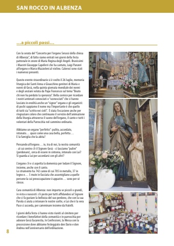 SAN ROCCO IN ALBENZA8Con la serata del %u201cConcerto per l%u2019organo Serassi della chiesa di Albenza%u201d, di fatto siamo entrati nei giorni della festa patronale in onore di Maria Regina degli Angeli. Bravissimi i Maestri Giuseppe Capoferri che ha cantato, Luigi Panzeri all%u2019organo e Marco Mazzoleni al violino. Calorosi sono stati i numerosi presenti. Questo evento straordinario si %u00e8 svolto il 26 luglio, memoria liturgica dei Santi Anna e Gioacchino genitori di Maria e nonni di Ges%u00f9, nella quinta giornata mondiale dei nonni e degli anziani voluta da Papa Francesco sul tema %u201cBeato chi non ha perduto la speranza%u201d. Bella cornice per ricordare i nostri antenati conosciuti o %u201csconosciuti%u201d che ci hanno lasciato in eredit%u00e0 anche un %u201csignor%u201d organo e gli organisti: di pochi sappiamo il nome ma l%u2019importante %u00e8 che quello di tutti sia %u201cscritto nei cieli%u201d. %u00c8 stata l%u2019occasione anche per ringraziare coloro che continuano il servizio dell%u2019animazione della liturgia attraverso il suono dell%u2019organo, il canto e tutti i volontari della Parrocchia nel cammino ordinario.Abbiamo un organo %u201cperfetto%u201d: pulito, accordato, intonato%u2026 quasi come una casa bella, perfetta%u2026 E la famiglia che la abita? Pensando all%u2019organo%u2026 io, tra di noi, la nostra comunit%u00e0 - al cui centro c%u2019%u00e8 il Signore Ges%u00f9 - ci lasciamo %u201cpulire%u201d (perdonare), cerca di essere in sintonia, intonato con Lui? Si guarda a Lui per accordarsi con gli altri?L%u2019organo c%u2019%u00e8 e ci aspetta la domenica per lodare il Signore, insieme, anche con il canto.Lo strumento ha 742 canne di cui 705 in metallo, 37 in legno e%u2026 5 mute in facciata che assomigliano a quelle persone la cui preoccupazione %u00e8 apparire%u2026 sono per s%u00e9 stesse.Cara comunit%u00e0 di Albenza: non importa se piccoli o grandi, in vista o nascosti: c%u2019%u00e8 posto per tutti affidandosi al Signore che ci fa gustare la bellezza del suo perdono, che con la sua Parola ci aiuta a intonare le nostre scelte, e Lui che %u00e8 la vera Pace ci accorda, per camminare insieme da fratelli.I giorni della festa ci hanno visto riuniti al cimitero per ricordare i benefattori della comunit%u00e0 e in parrocchia per adorare Ges%u00f9 Eucarestia, le Confessioni, la Messa con la processione dove abbiamo festeggiato don Dario e don Andrea nell%u2019anniversario dell%u2019ordinazione. %u2026a piccoli passi%u2026