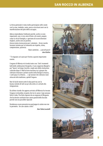 9SAN ROCCO IN ALBENZALa festa patronale %u00e8 stata molto partecipata nelle serate con la cena, tombola, ruota, pesca e da alcuni anni con la manifestazione del palo della cuccagna.Adesso riprendiamo l%u2019ordinario perch%u00e9, anche se sono importanti, non si vive solo di feste e di eventi, proprio come la vita di famiglia; e speriamo di essere diventati migliori, anche solo un pochino.Ancora tanta riconoscenza per i volontari... festa %u00e8 anche lavorare insieme per la Comunit%u00e0 con rispetto, stima, comprensione, pazienza.Buon cammino%u2026a piccoli passi!don Giulivo%u201c Ti ringrazio col cuore per l%u2019invito a questo importante evento.L%u2019organo di Albenza mi ricorda tante cose. Tutti i momenti belli delle celebrazioni liturgiche, il caro organista Mangili e poi %u201cSpera%u201d, nel dopo Concilio e negli anni della rivoluzione culturale dopo il 1968 la forte tensione tra i giovani che volevano innovare e portare anche nella liturgia la musica, i canti pop e la chitarra%u2026 e gli anziani che volevano stare attaccati alla tradizione, quindi l%u2019organo.Non fu facile tenere unite le due parti ma con la buona volont%u00e0 di tutti un po%u2019 alla volta si %u00e8 arrivati alla integrazione.Da ultimo ricordo che appena arrivato all%u2019Albenza ho trovato l%u2019organo in disordine al punto che tra le canne i topi avevano fatto il nido, l%u2019ho fatto riparare da un organaro di Bergamo che ha dovuto sostituire due canne grandi della facciata perch%u00e9 non era possibile ripararleDesideravo essere presente ma purtroppo la salute non me lo permette. Un caro saluto a tutti.%u201dDon Tobia Locatelli